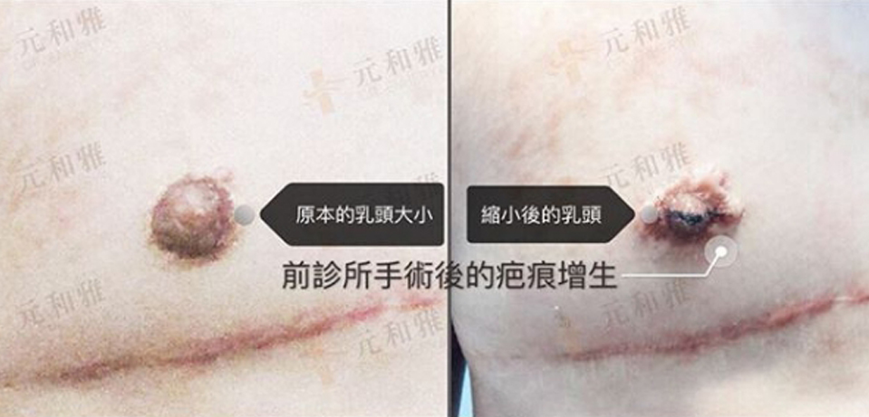 前診所將乳頭跟乳暈包在一起了,導致整個乳頭變大,沒有乳暈。