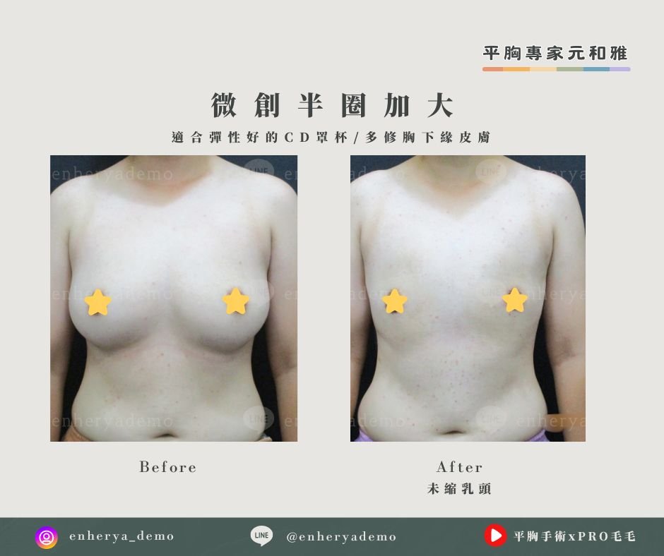 以往平胸手術的技術大罩杯只能使用一字型平胸手術,元和雅平胸手術觀念除了追求平整以外,更要求客戶胸型的整體美觀。大家總是認為只有小罩杯(A或B罩杯)才能進行乳暈微創手術,目前即使大罩杯(C或D以上)也有機會以微創小傷口進行。